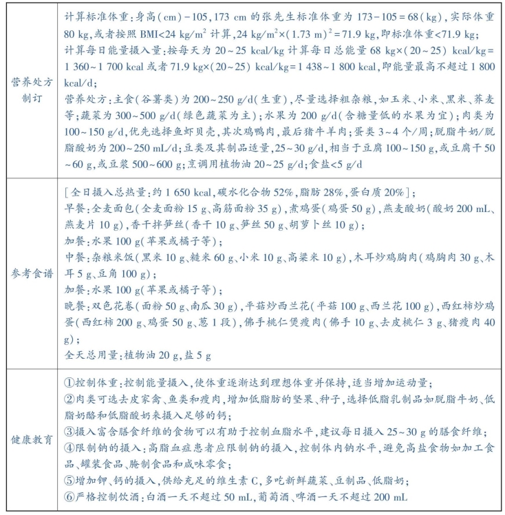 ②调整膳食结构:控制总能量摄入;限制脂肪和胆固醇摄入;适量的蛋白质和碳水化合物;充足的维生素、矿物质和膳食纤维;饮食宜清淡、少盐;戒烟、限制饮酒,禁烈性酒。