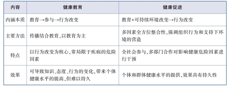人类生物学因素、环境因素、卫生服务因素和行为与生活方式因素都可能对健康产生重要影响。作为公共卫生的重要组成部分,健康教育与健康促进以社会生态学模型为基础,通过改革健康支持性政策、改善物质和社会环境、发展个人健康技能、动员社区参与和重新定向卫生服务,运用倡导、赋权和协调等社会策略,在科学理论和模型的指导下,提高人们的健康素养,促进健康行为的形成,消除或减少健康危害因素,达到预防疾病,提高健康水平和生活质量的目的,是解决人类健康问题的重要措施之一。针对健康教育与健康促进的关系,一方面,健康教育是健康促进的基础。政策、法规、组织以及其他环境的支持都是健康促进的组成部分,需要与健康教育相结合。如果没有健康教育,健康促进将成为徒有虚名的概念。此外,健康促进是健康教育在社会环境层面的发展。健康教育尽管能成功地帮助个体改变不利于健康行为的策略,但如果得不到有效的环境和政策的支持,效果是难以持续的。因此,健康教育与健康促进是协同共存、互利互生的,两者之间具体区别也进行了详细梳理(表12.1)。