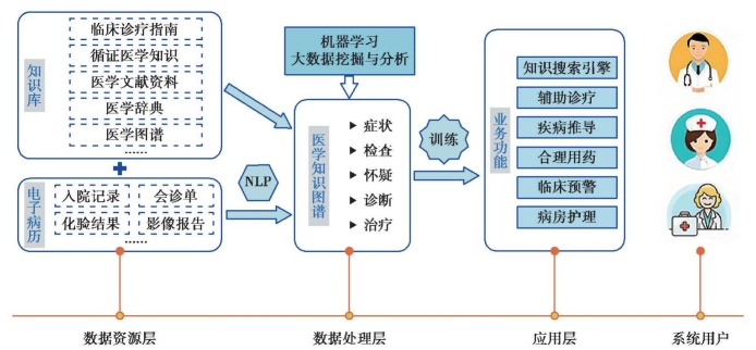 ①知识库与规则引擎:这个模块包含医学知识库和规则引擎,用于存储和管理医学知识、指南、协议等。它可以提供基于证据的决策支持,通过预定义的规则和算法来辅助医生进行诊断、治疗方案选择等决策。