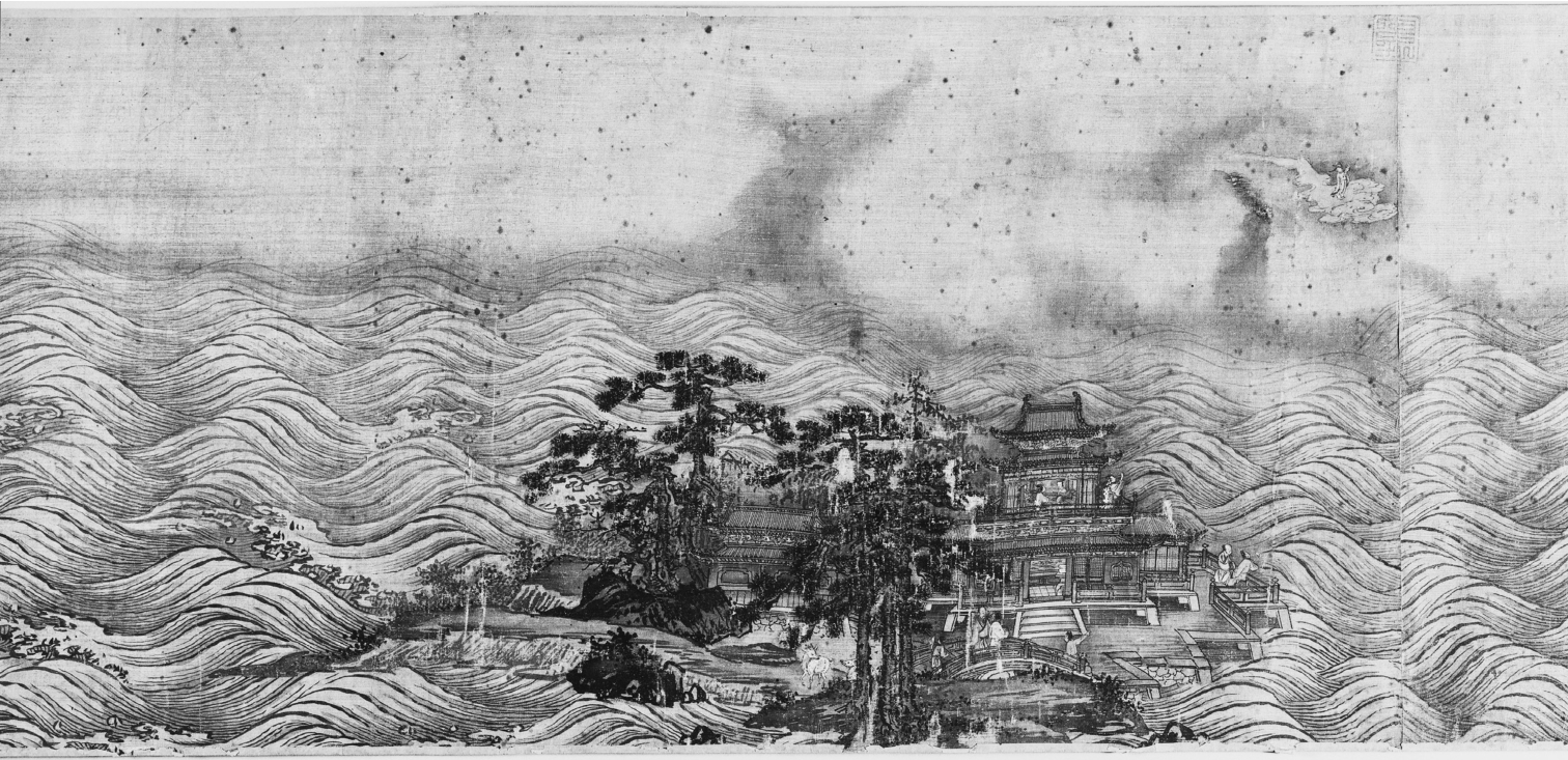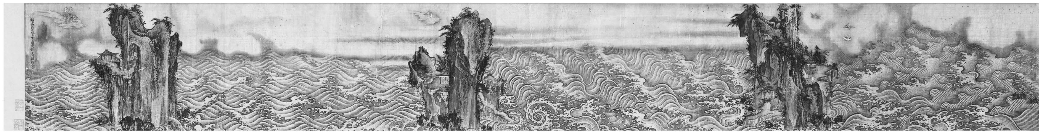 图8.3 描绘方壶、瀛洲和蓬莱仙岛的卷轴画局部,明代,15世纪,未知画家仿元代画家溥光(活动于约1286—1309年)所作。绢本水墨设色。整体尺寸31.5厘米×970厘米。皇家安大略博物馆,2005.22.1。在A.查尔斯·贝利(A. Charles Baillie)先生和夫人的慷慨支持下收购。© Royal Ontario Museum.