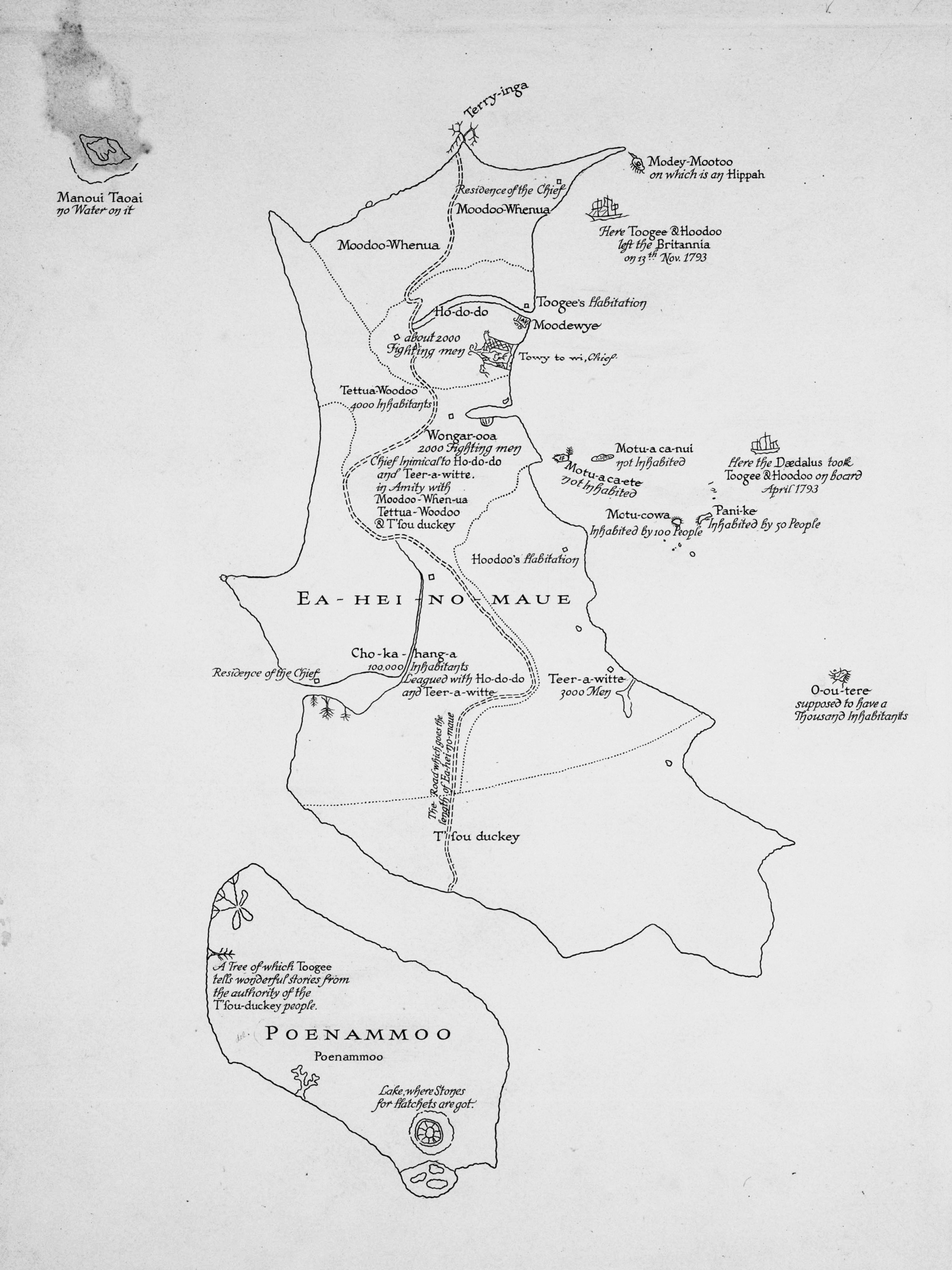 斯科特以所罗门群岛的马基拉(Makira)岛为例,描述了“松散地联系在一起的传说和传统,(它们)非常朦胧,由未限定界线的切线组成,它们生产出了宗教中心、圣地——祖国——由非凡的事迹和举动塑造而成的充满情感的景色,并从中分离出来”(2012:121)。就像围绕着“欧洲中世纪之事”(布伦丹的传说和它神奇的群岛或许也算得上)的思想云雾一样,海洋的故事是围绕着海中的岛屿传说和身份而形成的文化、身份和神话故事的基质。太平洋岛屿文化中包含许多具有欧洲神话特征的岛屿:汤加和斐济的神话中有一座位于东北某处的“女人岛”,充满美丽但危险的仙女(hotooas)(Egeler 2017:308)。这些故事可能有着共同的特点,但它们体现出不同的表现形式,埃格勒称之为“在现实世界的坐标内找到神话中的异世界的愿望”(308)。海洋中的想象和与海洋有关的想象将故事联系在一起。