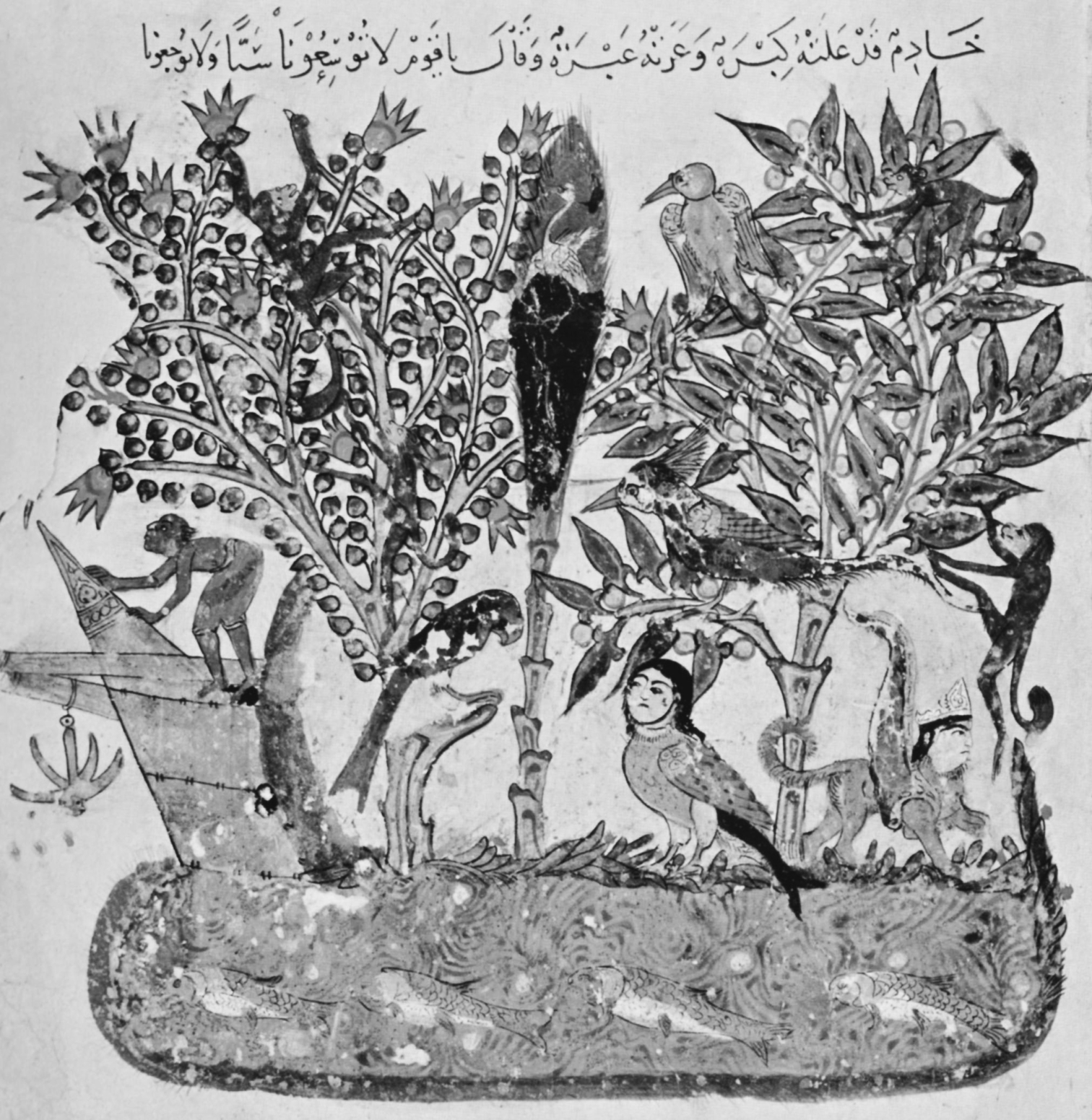 在中世纪的阿拉伯世界,我们遇到了“‘ajā’ib”(单数形式为‘ajab)(意为惊奇),即大自然的奇事、奇迹和奇观。不管这些奇观是在科学理解的范围之内还是超出了科学理解的范围,它们都属于真主创造的奇观(Shafiq 2011:15)。许多最为生动的中世纪奇迹出现在10世纪的《印度奇观》(Kitāb ‘ajā’ib al-hind)中。我们在书中遇到了许多古典的、中世纪的奇迹,它们勾勒出横跨七海的丰富的印度洋世界,一个吸引着各文化各信仰的人们在丰富而多变的网络中和睦相处的世界(163)。这个世界从南中国海延伸到红海和波斯湾的顶端,一个个港口、一条条航程,让货物、故事和思想得以流通。这些地方所引起的富有想象力的反应,从哈利里所讲的12世纪的故事集《玛卡梅》中一则海难故事的插图可以清楚地看到(图8.5)。这个版本的插图画家13世纪上半叶在南伊拉克工作,他署名为“al-Wasiti”(瓦西蒂),这个名字起源于巴士拉附近的瓦西特(Wasit)。他让他的岛上居住着一些奇怪的生物,如鹦鹉、猴子,以及一个鸟身女妖,和一只有翅膀的人头猫,这两种图案常被用在金属制品和其他装饰艺术中。