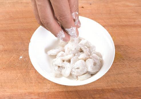 3 放入碗中,加入精盐、料酒调味,再放入淀粉上浆;锅中加油烧至四成热,放入虾仁滑散、滑透,倒出沥油。