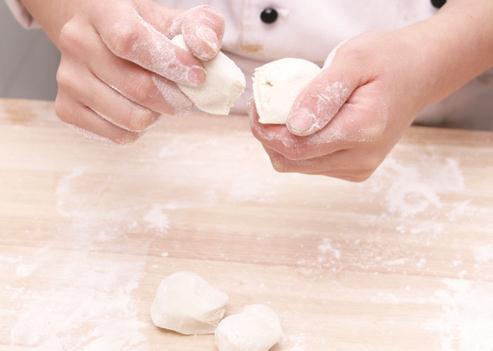 2 将面粉加入酵面、温水揉成面团,略饧,再搓成长条,揪成小面剂,擀成圆皮;然后放上什锦馅料,提褶收口捏成包子形,摆入蒸锅中,用旺火蒸15分钟至熟,取出即成。