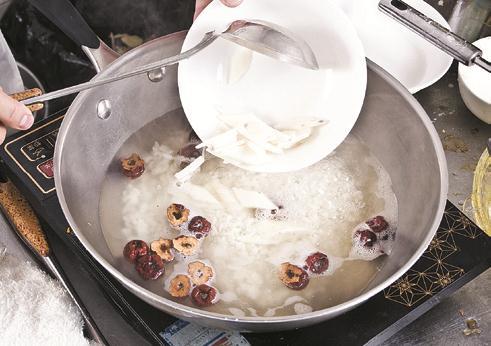 3 将冰糖放入锅内,加少许清水,熬成冰糖汁,再倒入粥锅中,搅匀即可。