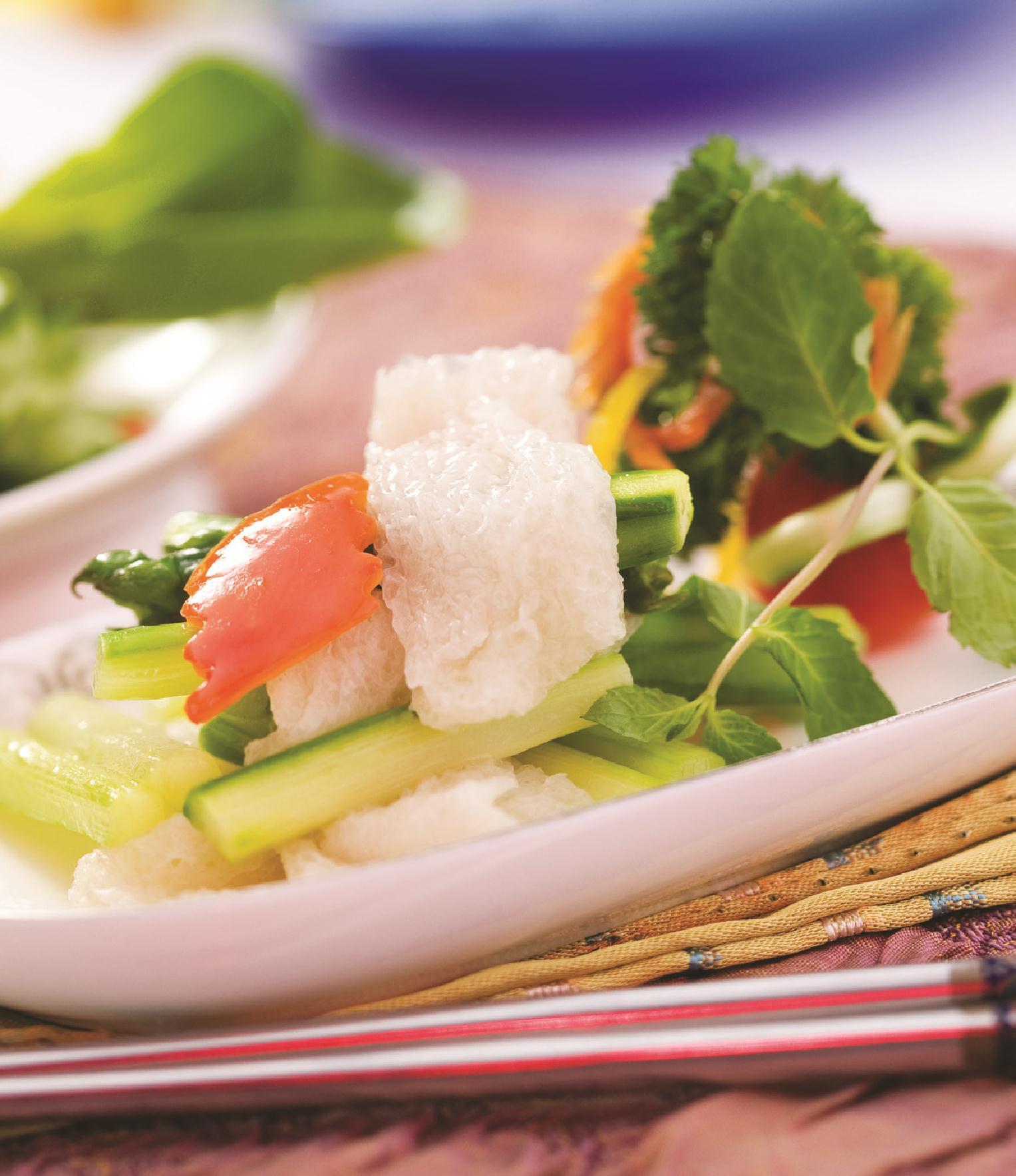 1 芦笋去根及老皮,洗净,切成长段,放入加有少许精盐的沸水中焯熟,捞出沥干。