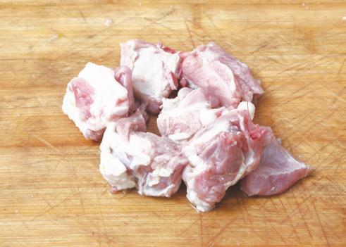 1 猪脊骨洗净,剁成大块,放入清水锅中烧沸,焯烫出血水,捞出冲净。