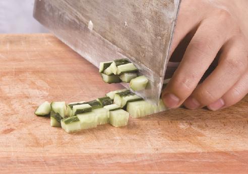 1 胡萝卜去皮,洗净,切成1厘米大小的丁;黄瓜洗净,去皮,切成小丁;豌豆洗净,沥去水分。