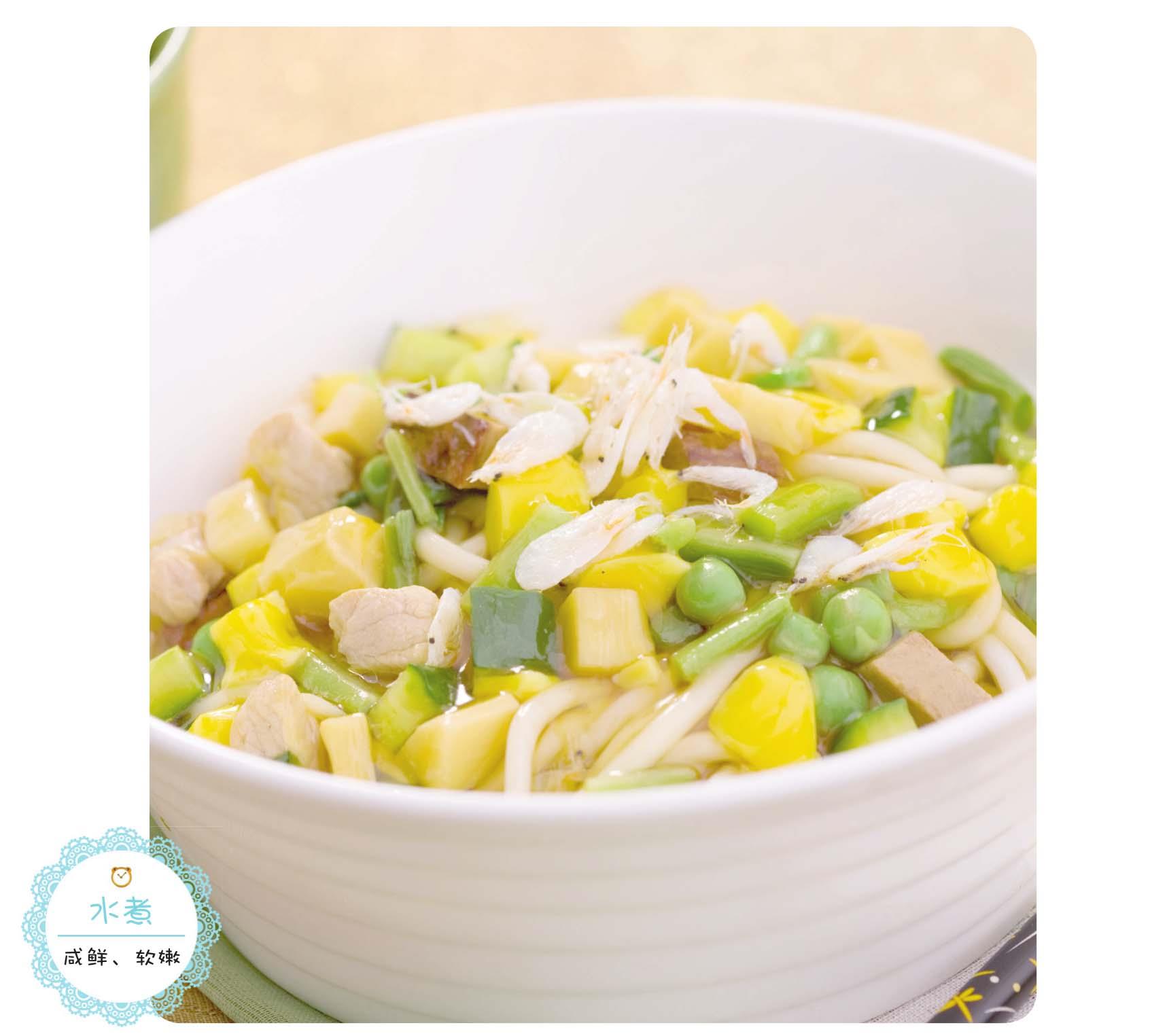 2 猪瘦肉洗净,切成小丁,放入沸水锅中焯透,捞出沥水。锅中加入肉汤、海米、青豆、熟笋、蛋羹、黄瓜、蒲菜、肉丁烧沸,加入精盐调味,出锅浇入面条碗中即成。