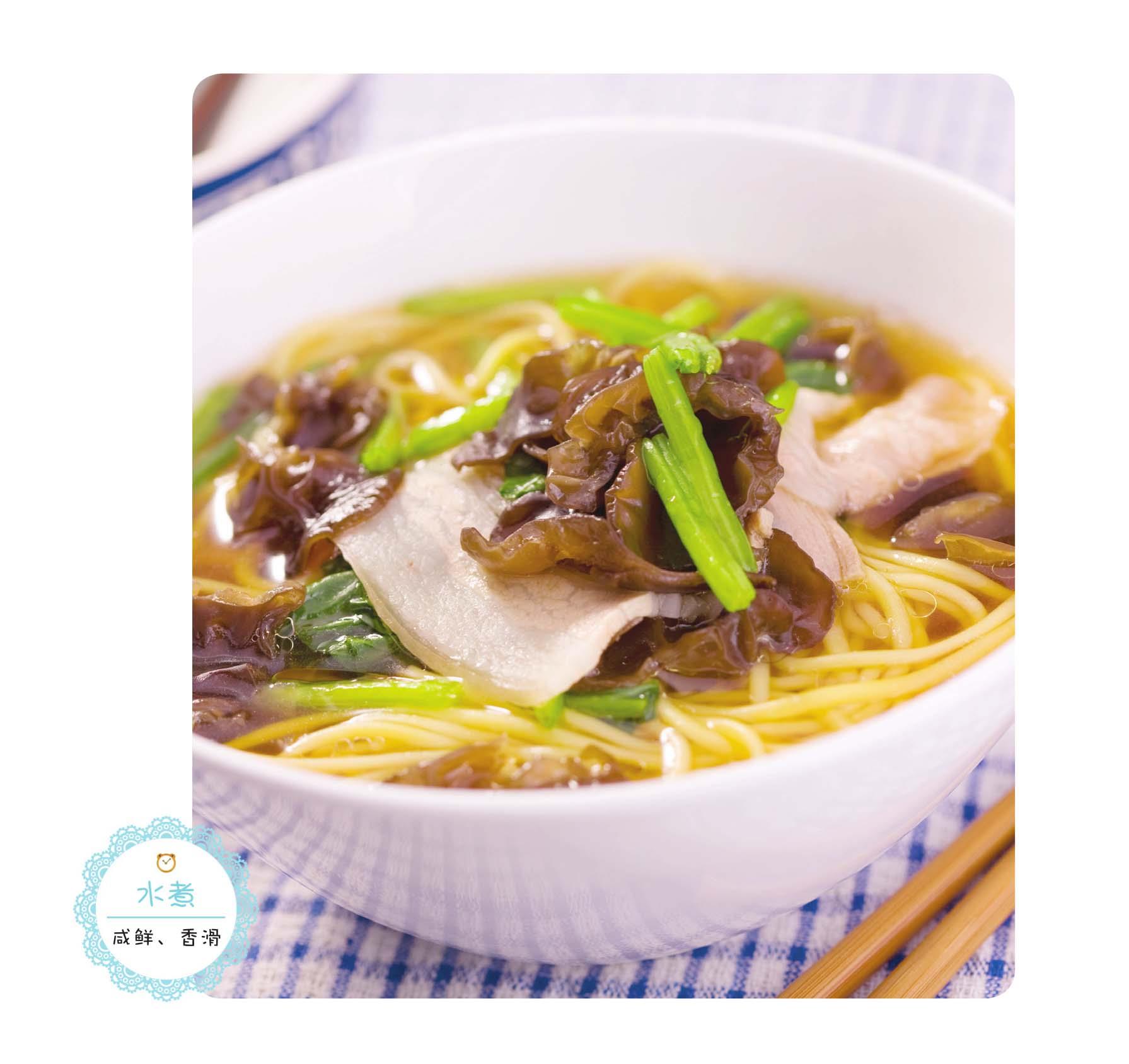 玉米面条200克,熟猪五花肉75克,菠菜50克,水发木耳20克。