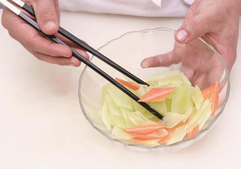 2 把甘蓝洗净,沥去水,切成均匀的丝;芥菜择去根、叶,洗净,沥去水,切成3厘米长的段;胡萝卜洗净,削去外皮,先斜切成片,再切成丝。