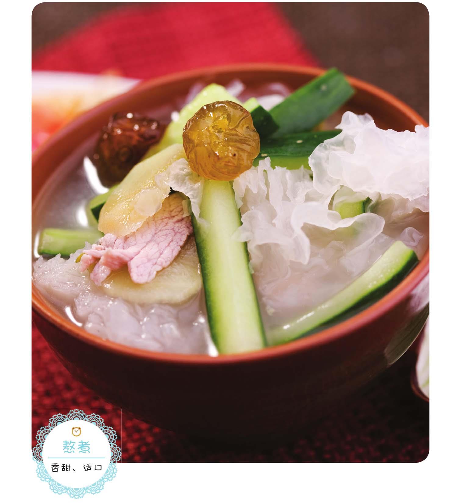 2 烧滚适量水,下黄瓜、雪耳、蜜枣、瘦肉和姜片,水滚后改用慢火煲约2小时,下精盐调味即成。