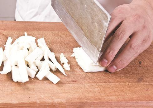 1 将干豆腐切成1厘米宽、5厘米长的小条。