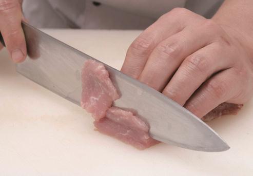 1 肥牛肉放在案板上,用快刀切成大薄片,放入碗中;加入少许精盐、料酒和淀粉拌匀上浆。