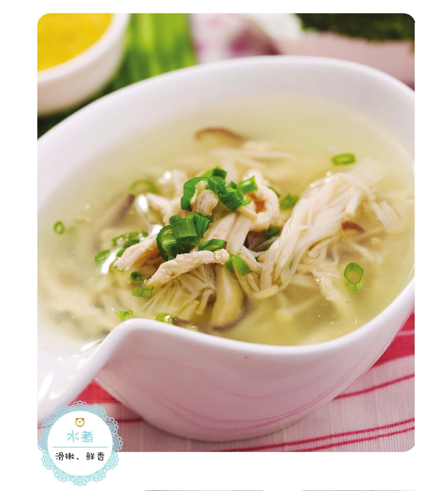 3 然后放入鸡肉丝煮至熟嫩,最后加入葱花、精盐煮匀,即可出锅装碗。