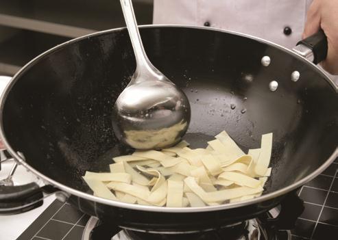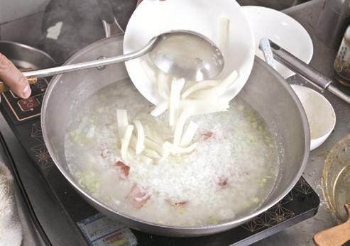 3 然后放入鸡肉丝煮至熟嫩,最后加入葱花、精盐煮匀,即可出锅装碗。