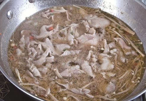 2 锅中加入适量清水,先下入黄花菜、冬菇丝、木耳,用旺火烧沸,再转小火煮约3分钟。