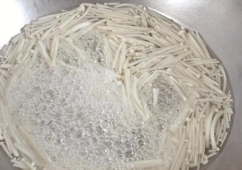 2 金针菇去根,洗净,放入沸水中焯一下,捞出用冷水过凉,沥净水分,切成小段。