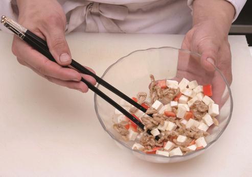 2 金针菇去根,洗净,放入沸水中焯一下,捞出用冷水过凉,沥净水分,切成小段。