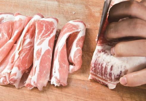 1 熟五花肉切成大薄片;辣白菜去根和老叶,切成小段。