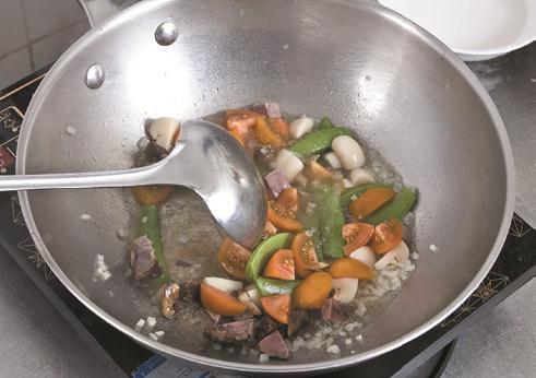 3 另锅加油烧热,下入葱末炒香,加入少许清水、卤牛腩味汁及牛腩块、番茄、口蘑、甜蜜豆。