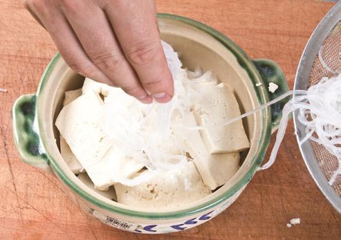 4 逐片放入肥牛肉片,待煮至熟透入味时,用水淀粉勾薄芡,盛入热的砂锅中即可。