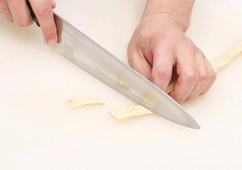 1 将干豆腐切成1厘米宽、5厘米长的小条。