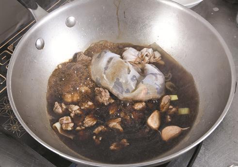 3 另锅加油烧热,下入葱末炒香,加入少许清水、卤牛腩味汁及牛腩块、番茄、口蘑、甜蜜豆。