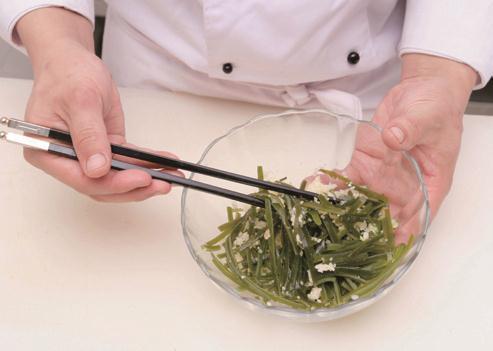 2 粉丝用温水泡软,切成长段,放入盆中,再加入海带丝、葱花、姜末、香菜段、蒜泥;然后加入精盐、香油、白醋、酱油调拌均匀,即可装盘上桌。