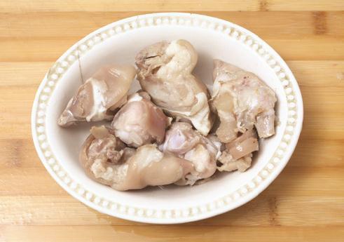 2 猪蹄刮洗干净,剁成小块,放入清水锅中烧沸,焯烫一下,捞出沥水。