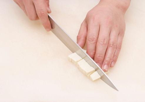 1 鲜松茸用刀削去根部,放入淡盐水中轻轻洗净,再放入沸水锅中煮约30秒钟,捞出过凉;豆腐用刀从中部横切一刀,再切成小方丁,放入沸水锅中煮约1分钟,捞出晾凉。
