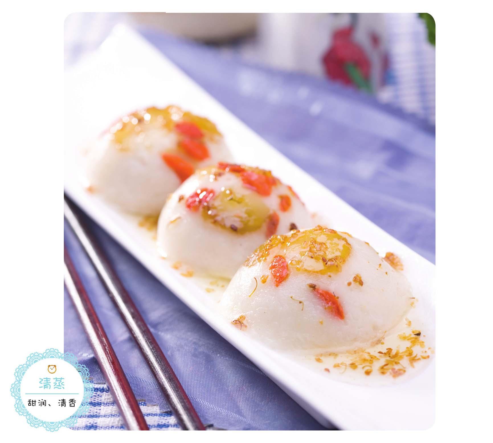 山药500克,糯米粉100克,蜜枣丁、糖桂花、熟莲子各50克,红瓜、糖板油丁各30克。
