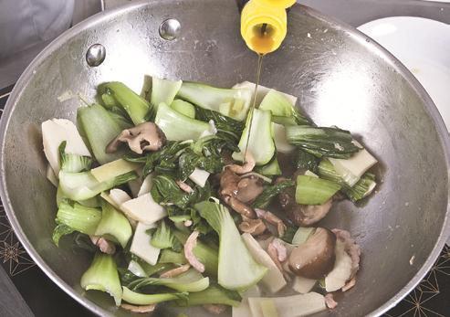2 锅中加油烧至五成热,先下入葱丝、姜丝炒香,再烹入料酒,放入虾干略炒,然后加入油菜心、冬笋、香菇煸炒片刻,再放入精盐翻炒至入味,淋入香油,即可出锅装盘。