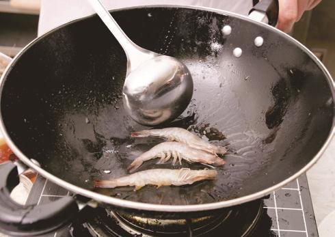 2 锅中加油烧热,放入大虾略炒,加酱油、料酒、精盐,放入油菜心、木耳炒匀。
