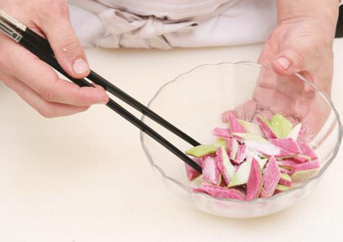 1 将萝卜皮洗净,切成菱形小块,放入大碗中,加入精盐13克拌匀,腌渍30分钟,取出,沥干水分。