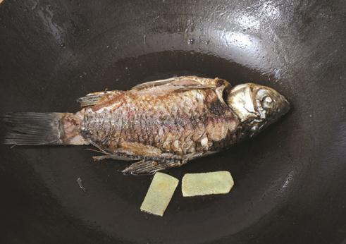 2 锅中加油烧热,先下入姜片炸出香味,再放入鲫鱼煎至两面金黄。
