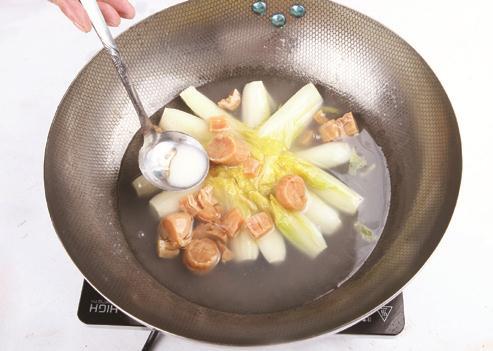 3 锅中加入少许油烧至七成热,下入葱花炒出香味;烹入料酒,放入海参片、火腿片、虾仁煸炒3分钟至熟;加入酱油、精盐快速炒匀,淋上香油,盛出。