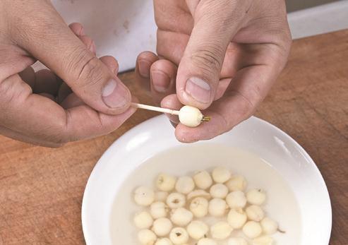 1 莲子用清水泡软,去心;白果去壳;乌鸡洗涤整理干净,剁成块,放入沸水中焯烫一下,捞出。