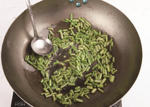 3 锅中留适量底油烧热,先放入韭黄段煸炒片刻,再烹入料酒,放入鸡蛋,然后加入精盐、鸡精、胡椒粉快速翻炒均匀,即可装盘上桌。