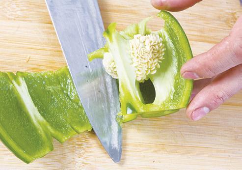 3 将青椒、红椒分别洗净,切去两头,去籽及筋膜,再片成薄片,下入沸水锅中焯熟,捞出。