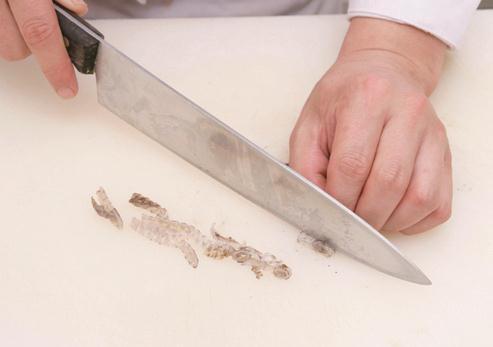 1 人参洗净,切成薄片;雪蛤用温水泡回软,择洗干净。