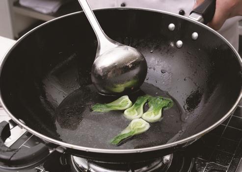 3 锅中加油烧热,下入姜片、葱段炒香,再加入鱼骨汤和清水烧沸,拣去葱段、姜片不用。