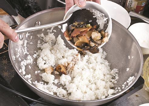 4 锅中加油烧至六成热,倒入大米饭,用中火煸炒5分钟;放入海参片、火腿片、虾仁,用旺火炒匀,出锅装盘即可。