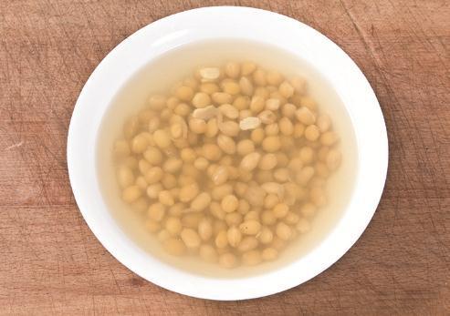 1 豆干以热水烫过,切成小丁;黄瓜、红辣椒去蒂、洗净,切丁待用;将黄豆洗净,泡水2小时,再放入蒸锅中蒸熟,取出备用。