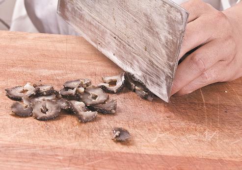 2 海参剖开,去除内脏和杂质,洗净后沥干,切成小片;锅中放入清水和水发海参片,慢慢加温烧沸,捞出沥水。