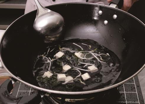2 锅置火上,加入适量清水烧沸,先放入小鱼干、豆腐块、海带段煮熟。