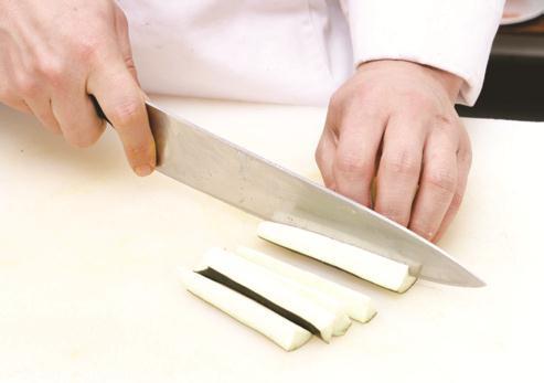 2 海参剖开,去除内脏和杂质,洗净后沥干,切成小片;锅中放入清水和水发海参片,慢慢加温烧沸,捞出沥水。