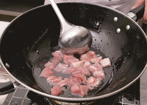 2 锅置火上烧热,加入植物油烧热,下入牛肉片滑熟,捞出沥油。