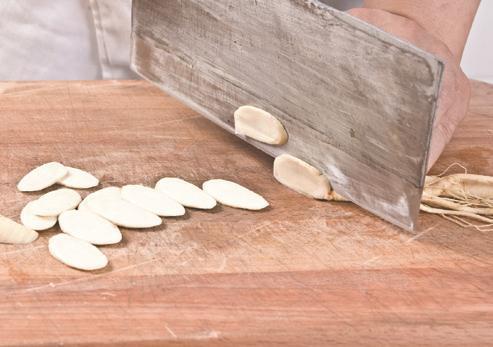 1 人参洗净,切成薄片;雪蛤用温水泡回软,择洗干净。