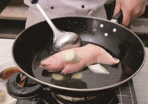 3 锅中加油烧热,下入姜片、葱段炒香,再加入鱼骨汤和清水烧沸,拣去葱段、姜片不用。